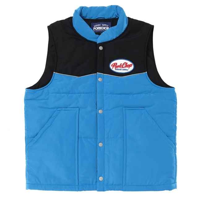 RACING VEST PORKCHOP ORIGINAL COLOR:BLU×BLK FABRIC:OUTER MATERIAL POLYESTER 100% LINING MATERIAL POLYESTER 100% PRIMALOFTの高機能中綿を使用 プリマロフト®は、アメリカ国軍の要請を受けたALBANY社が開発した、羽毛に代わる画期的な超微細マイクロファイバー素材です。プリマロフト®は羽毛のように軽くて暖かい保温性と柔軟性を発揮するだけではなく、羽毛にはない撥水性も発揮。機能性(断熱・防寒テクノロジー)と、どんな環境でも使える高い実用性を兼ね備えた画期的な人工羽毛です。 SIZE : 着丈×身幅×肩幅 M:67×60×44 L: 69×63×46 XL:71×66×48