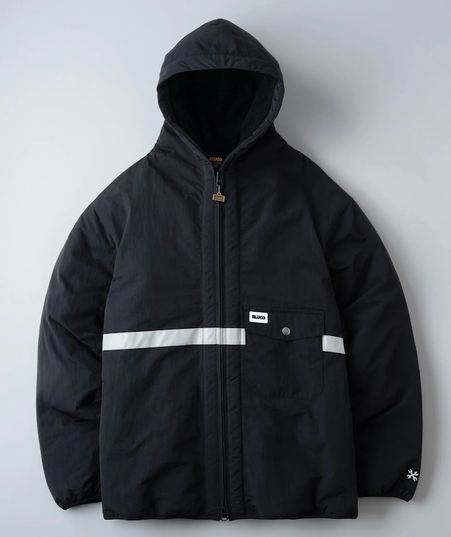 撥水性に優れたタスランナイロンの表地と、防寒性の高いシープボアを組み合わせたフードジャケット。軽量ながらしっかりとした保温力があり、日常からアクティブなシーンまで幅広く対応します。胸元と背面に配されたリフレクターテープが、視認性とデザイン性を両立。無骨さの中にBLUCOらしい機能美が感じられる、新たな定番となり得る一着です。 素材 表地 / ナイロン 100% 裏地ボア / ポリエステル 100% 袖裏地 / ポリエステル 100% 袖中綿 / ポリエステル 100% / 別布 綿 100% サイズ 着丈 肩幅 身幅 袖丈 M 着丈71.5 肩幅54 身幅62 袖丈60 L 着丈73.5 肩幅56 身幅65 袖丈62 XL 着丈75.5 肩幅58 身幅68 袖丈64
