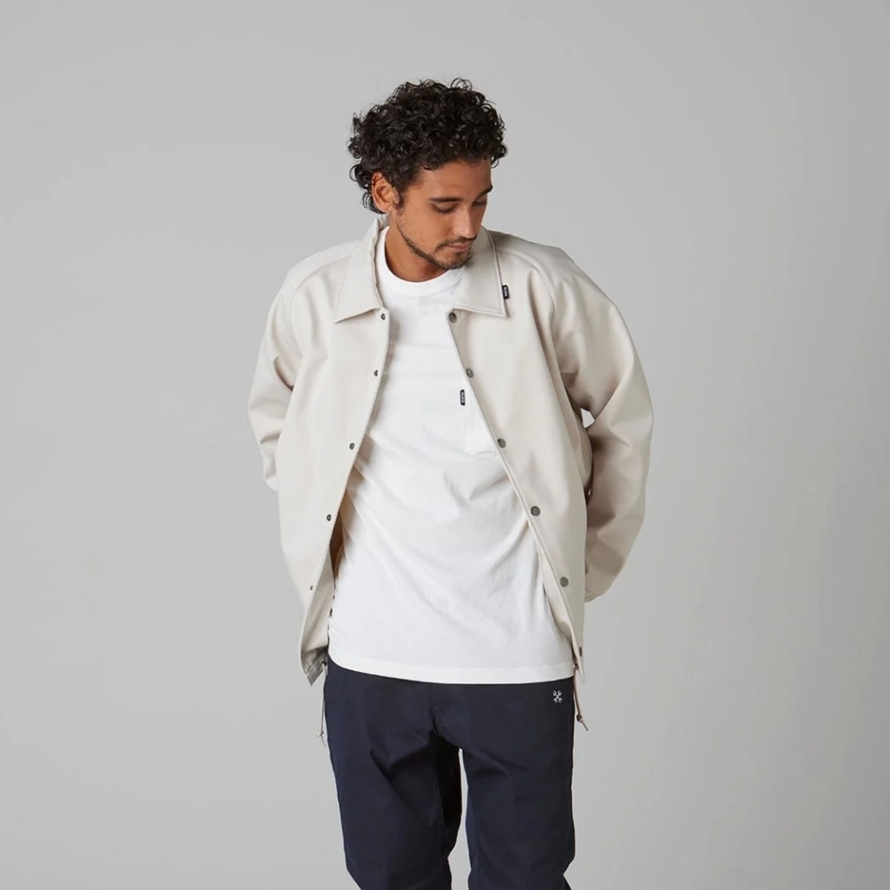 ストレッチボンディングT/Cツイルを使用した、今季新登場のコーチジャケット。裏面にフリースをボンディングした生地は、防寒性と着心地を両立し、柔らかな着心地と動きやすさも魅力です。秋口から春先まで、インナー次第で長く着用可能。街着としては冬向きですが、バイクライディング用途では春先に特に重宝する一着です。